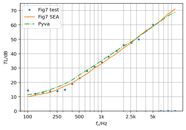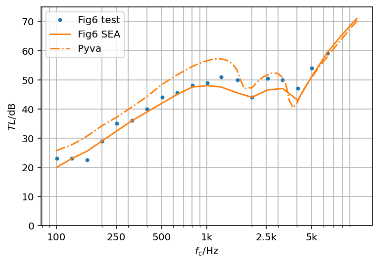 Please note, that at and above coincidence when all SEA assumptions are fulfilled, paper and pyva results agree very well with the test results.