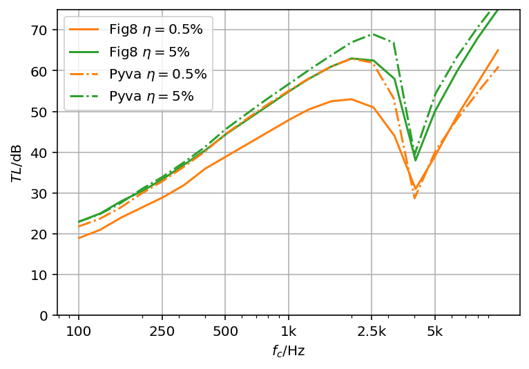 The second example is a non-symmetric configuration with one plate doubled in thickness. The resuls from pyva and from Figure 6 in the paper show the distinct coincidence frequencies. Paper and pyva results agree well above the second coincidence but below coincidence the transmission loss is also underestimated. However, the pyva result agrees better to the tests above the first coincidence of the thicker 6.38 plate at Hz.