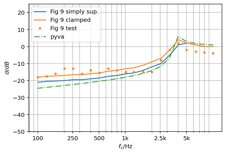 This can be seen when the radiation efficiency from pyva based on the Leppington4 method is compared to Figure 9 of the paper. The so called clamped result agrees well with the test result (that may include many paths). The pyva result is 10dB lower than the test. Form the authors experience from numerical studies and tests the radiation efficiency below coincidence is too high.